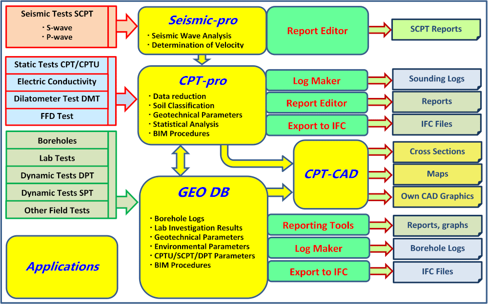 The CPT-pro program is closely related to the Seismic-pro, CPT-CAD and GEO DB programs. Mutual relationships and connections are presented in the diagram below.